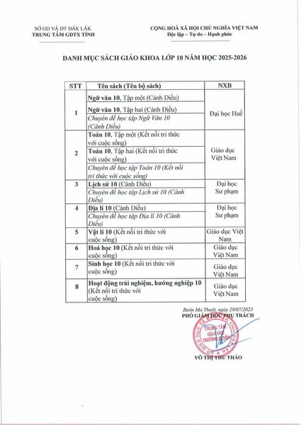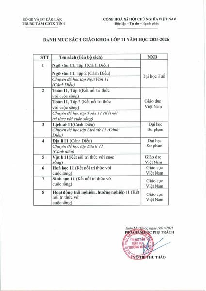 Danh mục sách giáo khoa sử dụng trong Trung tâm GDTX năm học 2025 - 2026